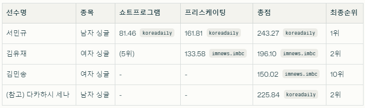 서민규는 튀르키예 앙카라에서 열린 대회 프리스케이팅에서 기술점수(TES) 83.46점, 예술점수(PCS) 78.35점으로 총 161.81점을 받았고, 앞서 쇼트프로그램 점수 81.46점과 합산하여 최종 243.27점으로 일본 다카하시 세나를 17.43점 차이로 꺾었습니다.