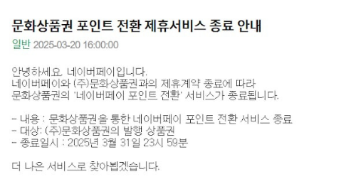 현재 네이버페이와 페이코는 문화상품권과의 제휴를 종료했으며, 예스24 역시 환전 서비스를 중단했습니다.