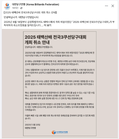 지난 20일, 대한당구연맹은 2025 태백산배 전국3쿠션당구대회(이하 태백산배)의 전격 취소를 발표하며 당구계에 큰 충격을 안겼다. 6월 18일 강원도 태백시에서 개최 예정이던 이 대회는 전문체육선수와 생활체육선수가 함께 어우러지는 전국 규모의 행사로 기대를 모았으나, 시상금 지급 방식을 둘러싼 논란으로 결국 취소라는 극단적 결정을 맞았다. 이 사태는 단순한 행정적 실수로 치부하기에는 당구연맹의 소통 부재와 운영 미숙이 드러난 중대한 사건이다.