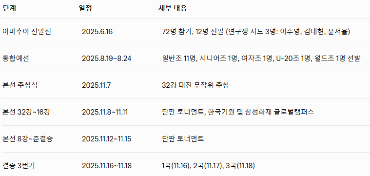 - 시드 증가: 한국 시드 4명→6명, 중국 2명→3명으로 국제 경쟁 강화.